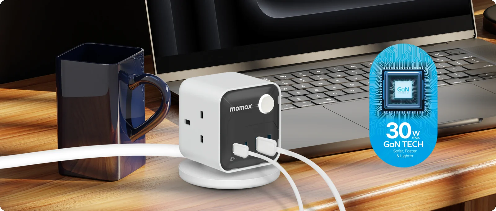 - 1-Charge Work Flow 3-Outlet GaN Power Cube 25W with USB Ports