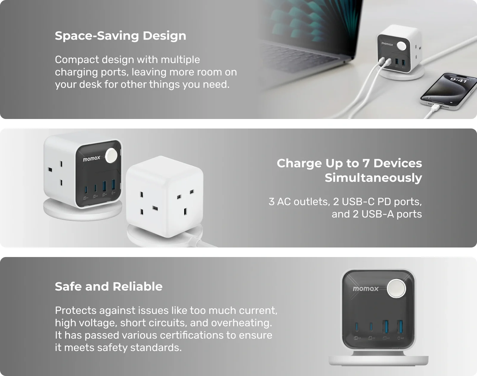 1-Charge Work Flow 3-Outlet GaN Power Cube 25W with USB Ports