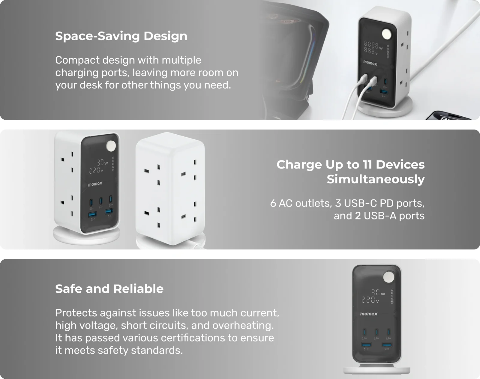 With the ability to charge up to 11 devices simultaneously, you can say goodbye to the clutter of tangled cords and multiple chargers. Our 6 AC outlets, 3 USB-C PD ports, and 2 USB-A ports let you power everything from your smartphone to your laptop all from one elegant solution. Convenience just got a serious upgrade!