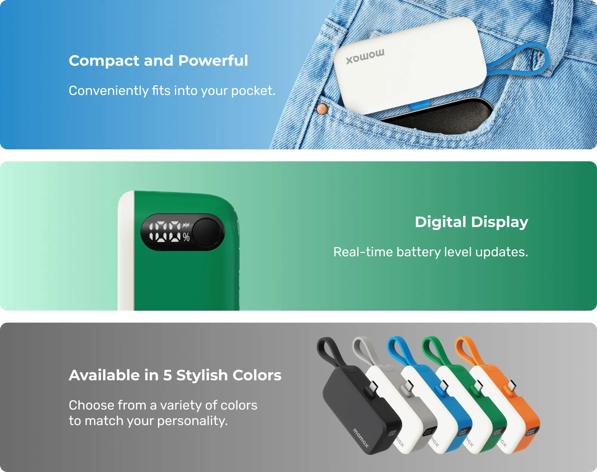 The Momax Power Mini's digital display provides real-time battery level updates, allowing you to accurately monitor your power reserve and plan recharges to avoid unexpected power outages, ensuring your devices are always ready to use.