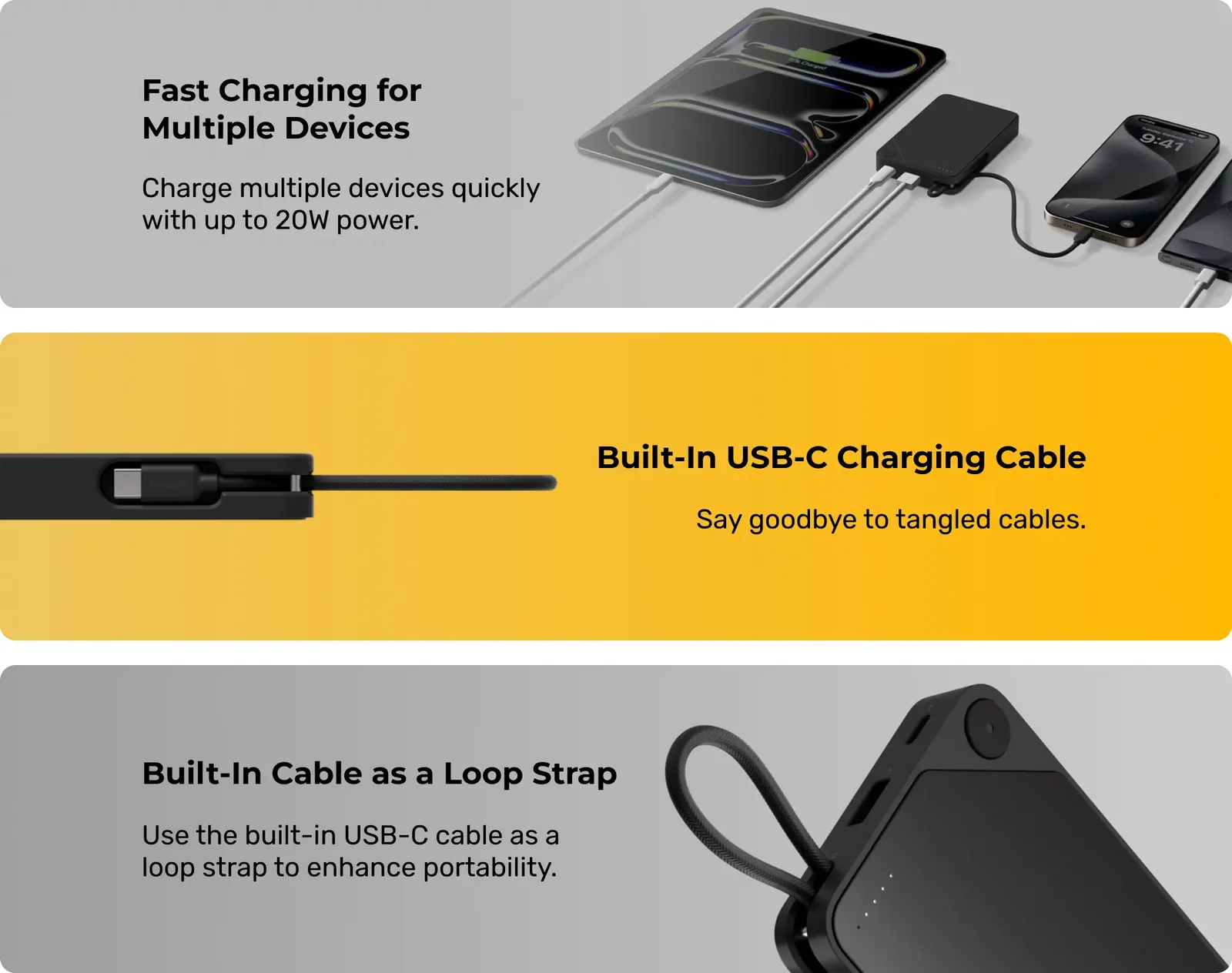 1-Power X Battery Pack (10,000mAh) with Built-in USB-C Cable