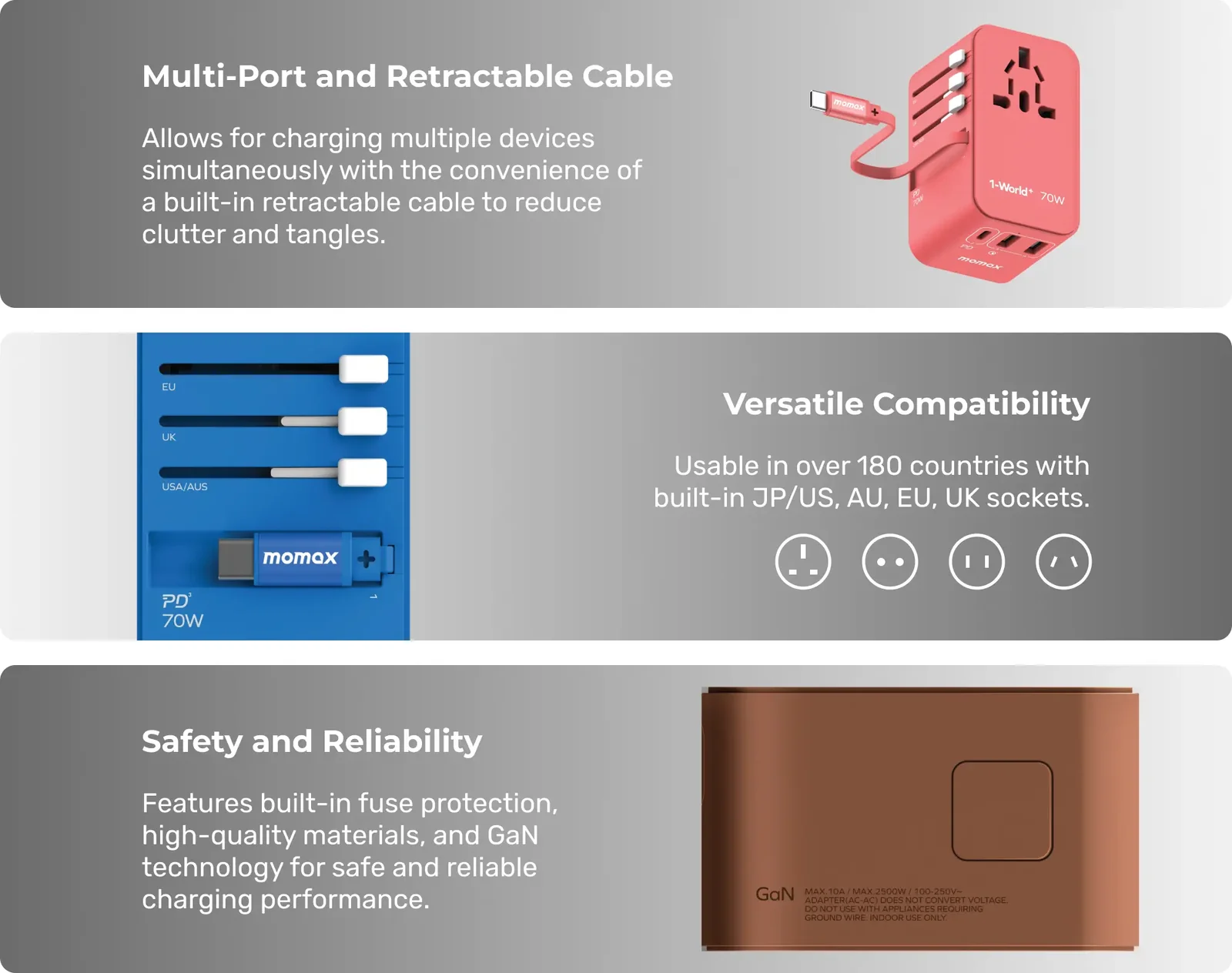 Introducing the 1-World+ Universal 3-Port Travel GaN Charger 70W – your essential partner for fast charging no matter where you are. Designed for efficiency and adaptability, it ensures your devices are powered up swiftly and safely.