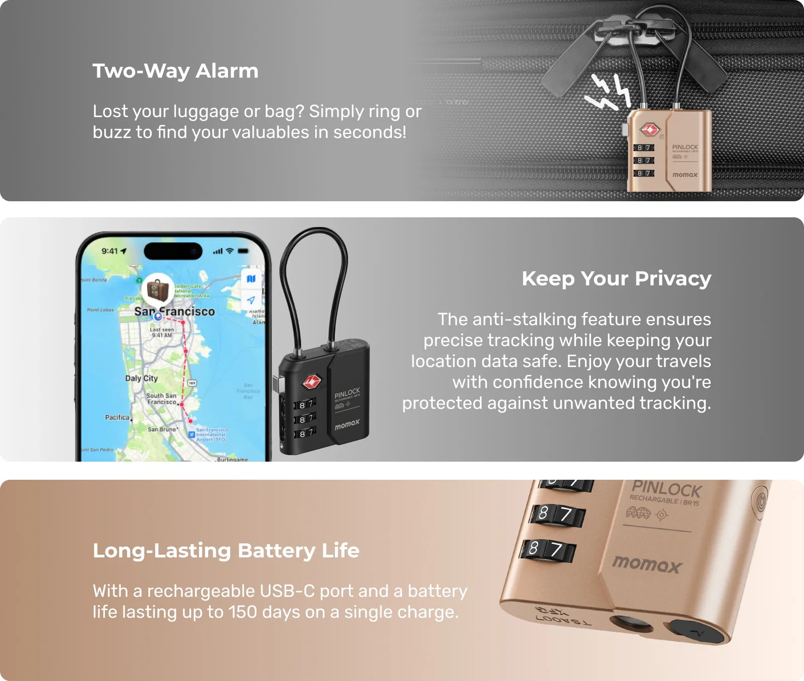 No more stressing about lost luggage and misplaced valuables. Our PinLock seamlessly integrates with the Apple Find My app, making it a breeze to keep tabs on your belongings.
